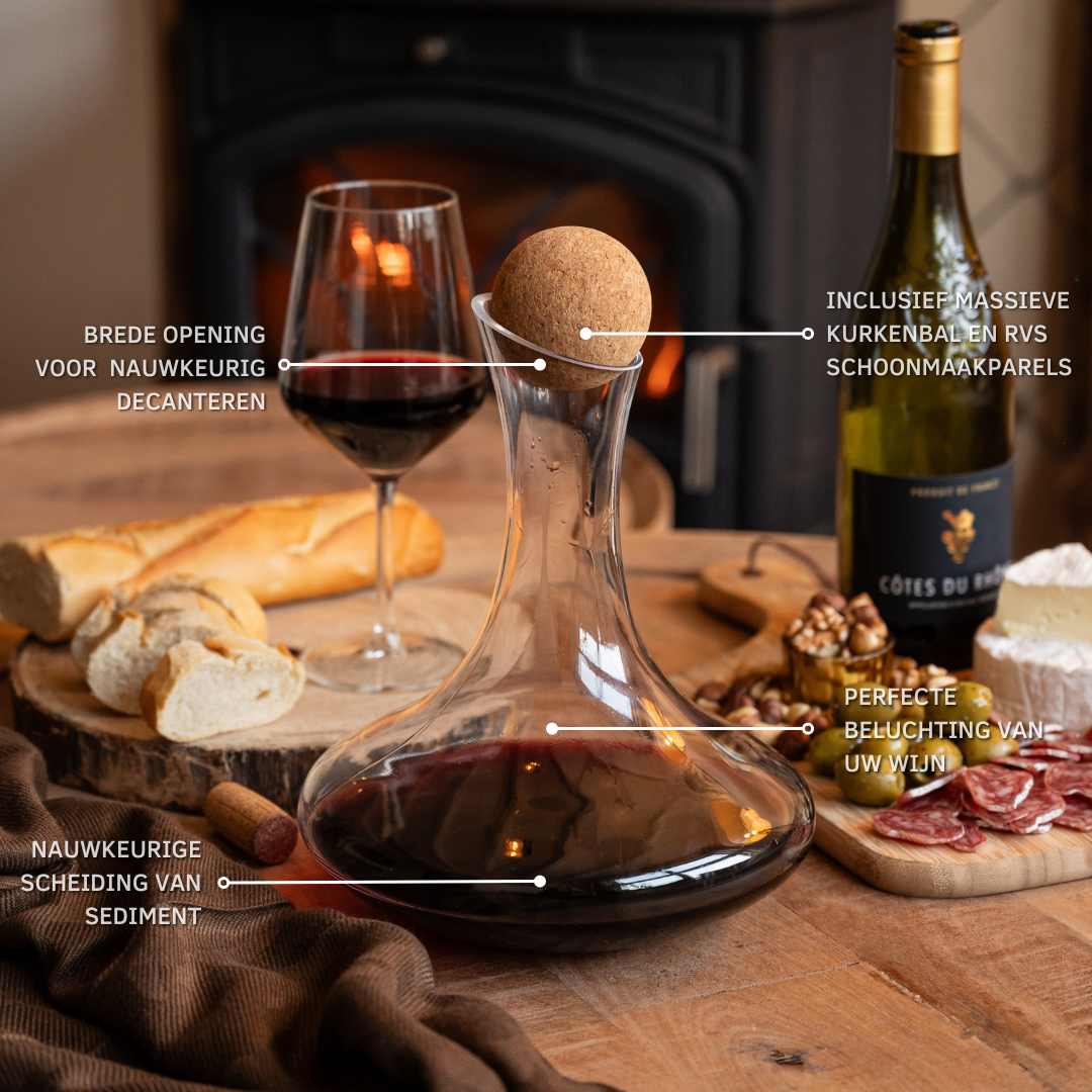 Decanteren scheidt de wijn van eventueel bezinksel en zorgt ervoor dat de wijn kan ademen. Hierdoor komen aroma’s beter vrij en wordt de smaak zachter en voller.